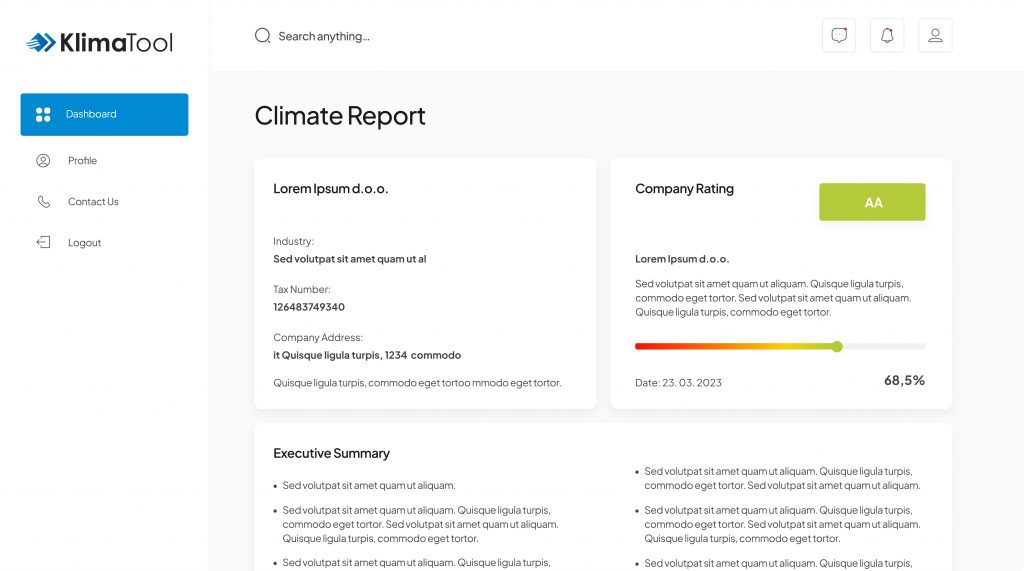 We support small and medium-sized enterprises (SMEs) and the financial sector in the Western Balkans to build a sustainable future. Transparent, consistent, and accessible data is crucial for directing capital towards businesses that have a positive impact. KlimaTool ensures that sustainability data is widely available and comparable for everyone involved. Our solution provides real-time information, empowers companies to have control over their own data, and promotes transparency.
